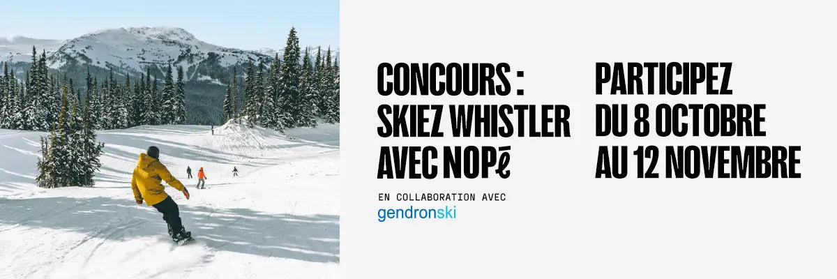 Le concours « Skiez Whistler avec NOPé » (le « Concours ») est organisé par 9434-2128 Québec inc. faisant affaires sous le nom NOPé (ci-après « l’Organisateur »), en collaboration avec Voyages Gendron inc. / Gendronski (ci-après « le Partenaire »).